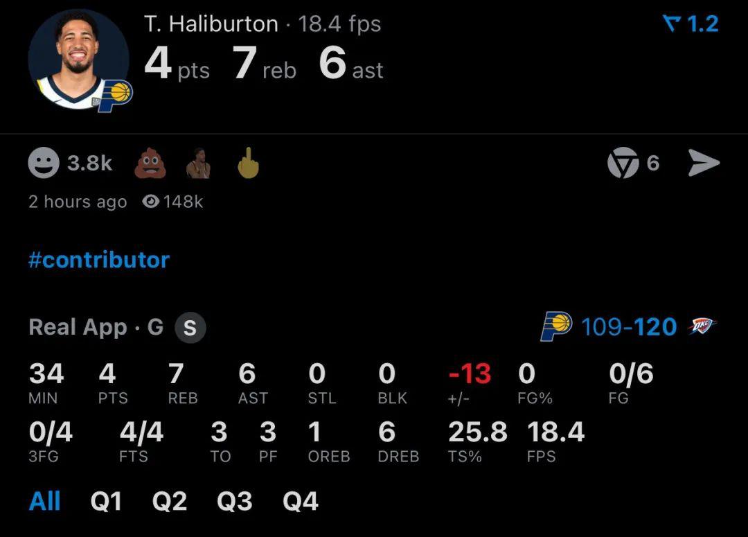哈利伯顿全场6中0,三分4中4